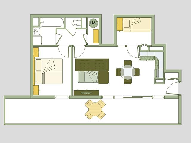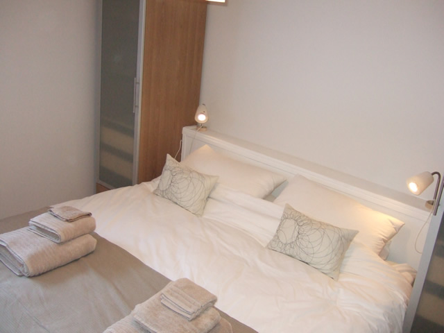 The large master bedroom has comfortable two-metre long beds that can be arranged as a super king-size or two singles. There are individual wardrobes with plenty of hanging space and drawers. The second bedroom has full-size 2m bunk beds. A double sofa-bed is also available in the living area.